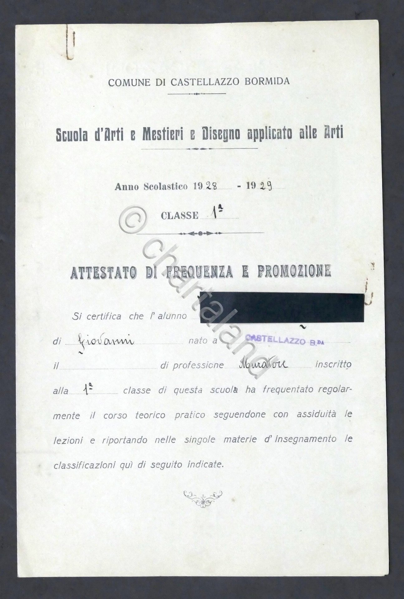 Castellazzo Bormida - Scuola d'Arti - Attestato 1^ Classe - Anno 1928 / 1929