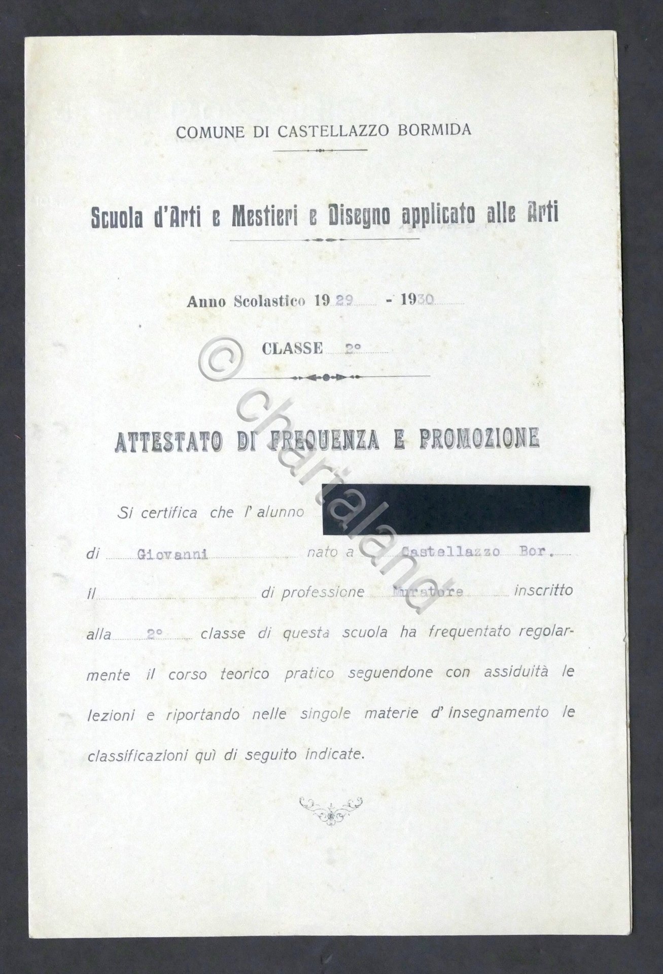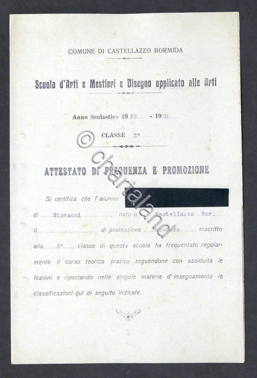 Castellazzo Bormida - Scuola d'Arti - Attestato 2^ Classe - Anno 1929 / 1930