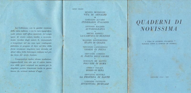 Opuscolo In-16°, due bifoli spillati per pp. non num. (8). Testo di presentazione, elenco dei volumi pubblicati e da pubblicare, testo di spiegazione delle modalità di acquisto dei Quaderni. Buono stato di conservazione.