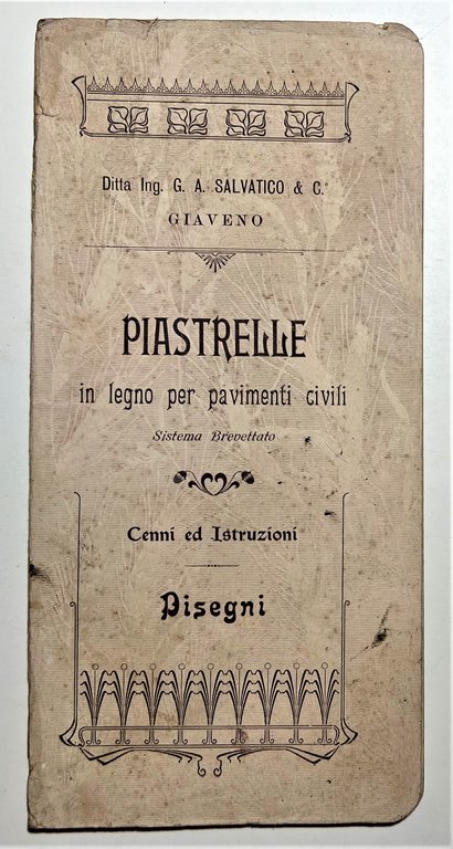 Catalogo - Ditta Ing. G. A. Salvatico & C. Giaveno - Piastrelli in legno per pavimenti civili -  1900 ca. Testo in lingua italiana. Pagine 18 di tavole illustrate. Copertina morbida. Condizioni molto buone con piccoli segni del tempo come da foto.