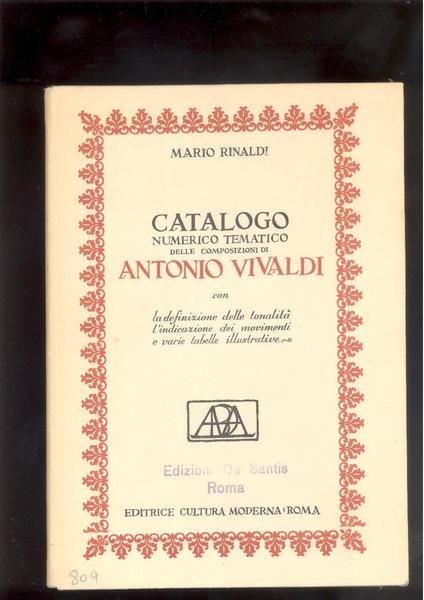 IN 8°, pp.311. LEGATURA EDITORIALE CARTONATA RIGIDA CON TITOLO ENTRO CORNICE.<BR>SONO ELENCATE 319 OPERE CON NUMEROSI ESEMPI MUSICALI. NELLA PARTE FINALE, <BR>TABELLE RIASSUNTIVE.TESTI IN ITALIANO, FRANCESE, INGLESE, TEDESCO. ANTONIO VIVALDI ( VE. 1678 - VIENNA 1741 ), COMPOSITORE E VIOLINISTA ITALIANO, CONSIDERATO TRA I MASSIMI ESPONENTI DEL BAROCCO MUSICALE. OTTIMA CONSERVAZIONE. ID, 6632.