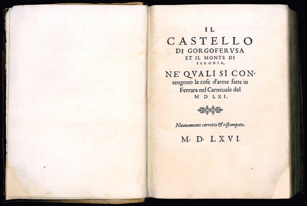 First collective edition (Il Monte di Feronia and Il Castello di Gorgoferusa had already been printed at Venice in 1561). The first two pieces are attributed to Agostino Argenti (cf. A. Solerti, Ferrara e la corte estense nella seconda metà del secolo decimosesto, Città di Castello, 1900, pp. XXVIII-XXXIX), whereas the newly added Tempio d'Amore to Giovanni Battista Pigna (cf. R. Baldi, Giovanni Battista Pigna, uno scrittore politico nella Ferrara del Cinquecento, Genoa, 1983, p. 35).