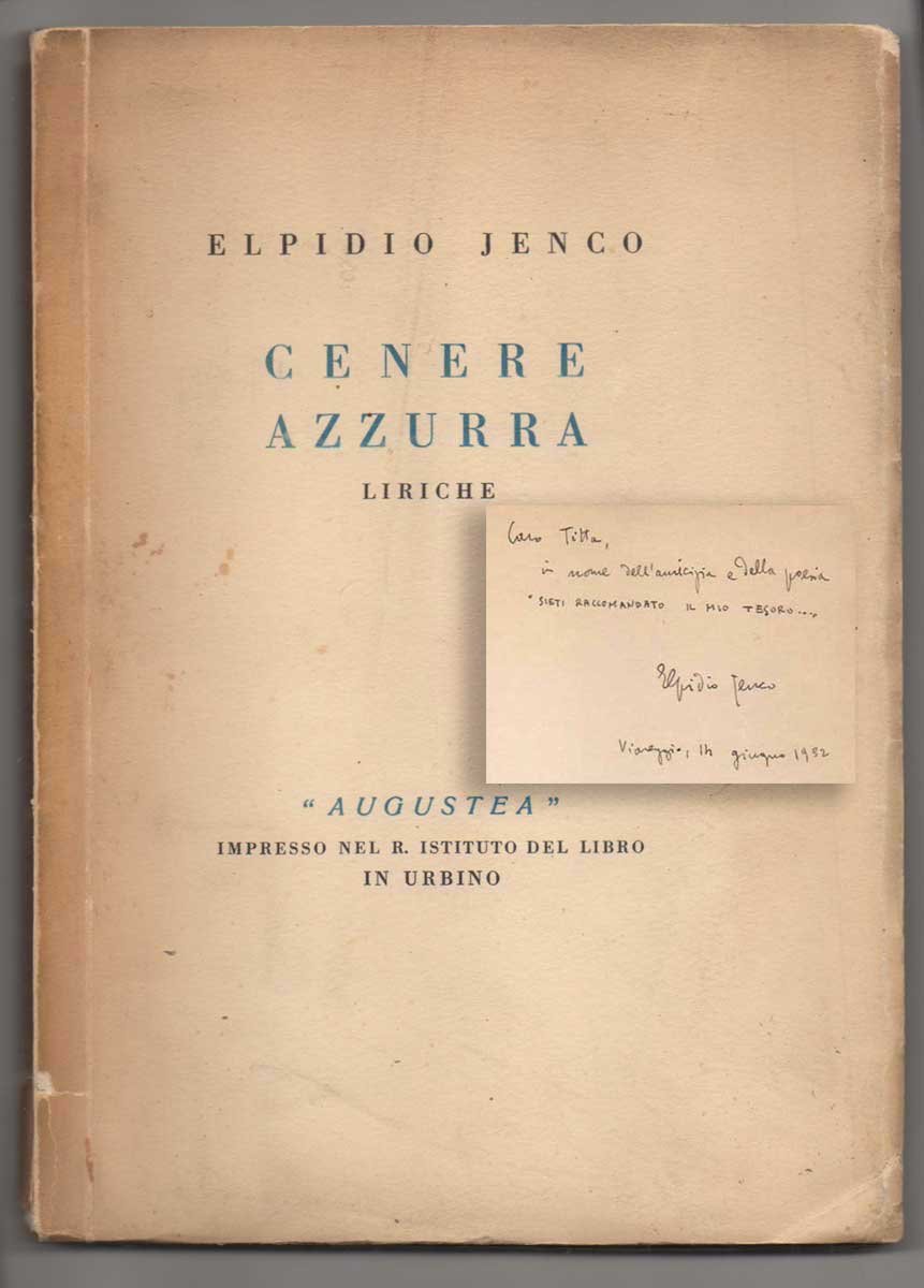 LIBROPrima edizione.CON AUTOGRAFO.Esemplare 54 di 500 numerati, in ottime condizioni e pregiato da dedica autografa dell’autore: «Caro Titta [Rosa], in nome dell’amicizia e della poesia “sieti raccomandato il mio tesoro.” | Elpidio Jenco | Viareggio, 14 giugno 1932» («Sieti raccomandato il mio Tesoro» è il penultimo verso con cui Brunetto Latini si congeda nel XV canto dell’«Inferno», invitando l’allievo a coltivare il suo «Tesoro», con riferimento all’opera del Latini «Tresor»): nel libro, discreti segni di lettura e interessanti annotazioni autografe nel testo in matita grigia, verosimilmente di Titta Rosa: «Sempre, o spessissimo in Jenco l’inizio è descrittivo; e principalmente di aspetti primaverili, e il suo stupore è vivo, d’un pittoricismo [.] nitido. Poi incede la nota poetica [.]».