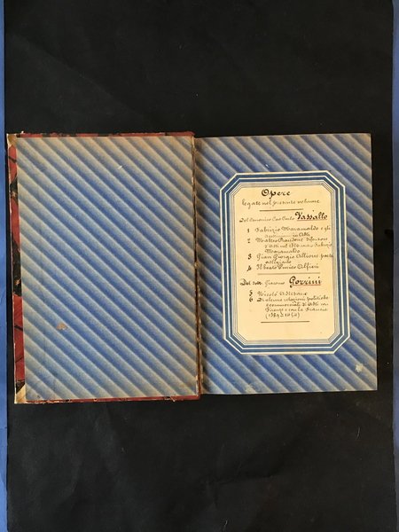 Opere legate nel presente volume: 1) autore Can. Prof. C. Vassallo; Fabrizio Maramaldo e gli Agostiniani in Asti; editore Paravia 1889; 2) autore C. Vassallo; Matteo Prandone difensore d'Asti nel 1526 contro Fabrizio Maramaldo; editore Carlo Clausen 1889; 3) autore C. Vassallo; Un nuovo documento intorno al poeta astigiano Gian Giorgio Alione; editore Carlo Clausen 1890; 4) autore C. Vassallo; Il B. Enrico Alfieri. Memoria; editore G. Vinassa 1890; 5) autore Giacomo Gorrini; Nicolò Astesano. Studio storico critico; editore Borgo 1886; 6) autore Giacomo Gorrini; Di alcune relazioni politiche e commerciali di Asti con Firenze e con la Francia rintracciate su documenti del Regio Archivio di Stato Fiorentino (1389-1454); editore Borgo 1887