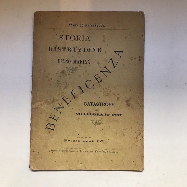 In-8°, pp. 39,(1), brossura editoriale con altro titolo: Storia e distruzione di Diano Marina . Beneficienza. Catastrofe del 23 febbraio 1887. Bruniture sparse Raro opuscolo stampato a scopo filantropico.