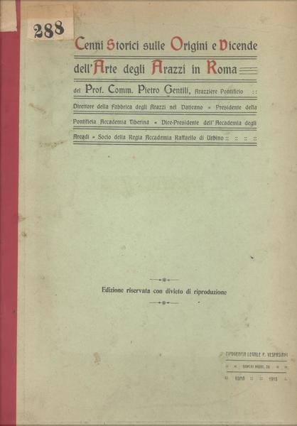 IN 4°, pp.79. CARTONATURA RIGIDA EDITORIALE CON TITOLO, RIMARGINATA CON NASTRO ROSSO. NUMEROSE ILLUSTRAZIONI in b/n. NEL TESTO. IL VOLUME E' OPERA DEL PROF. COMM. PIETRO GENTILI, CHE FU ARAZZIERE PONTIFICIO, DIRETTORE DELLA FABBRICA DEGLI ARAZZI DEL VATICANO, PRESIDENTE DELLA PONTIFICIA ACCADEMIA TIBERINA, VICE PRESIDENTE DELL'ACCADEMIA DEGLI ARCADI, SOCIO DELLA REGIA ACCADEMIA RAFFAELLO DI URBINO. OPERA DEDICATA ALLA SANTITA' DI BENEDETTO XV. EDIZIONE RISERVATA CON DIVIETO DI RIPRODUZIONE. AL FRONTESPIZIO, VECCHIA FIRMA DI APPARTENENZA E DEDICA<BR>DELL'AUTORE IN DATA 9 AGOSTO 1915. OTTIMA CONSERVAZIONE.ID 5524