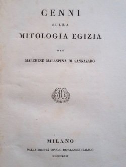 In-8° (cm. 22,7), legatura coeva in m. pelle con titolo in oro su tassello rosso e filetti in oro al dorso; pp. 110 [2] in buono stato; Ex libris araldico e dedica manoscritta del marchese Luigi Sommi Picenardi; fioriture sparse. Edizione originale di un saggio che nasceva dall'osservazione dei geroglifici acquistati dall'autore dal consolato austriaco in Alessandria d'Egitto, collezionati e interpretati grazie al famoso studio coevo di Champollion. Il museo del nobile Malaspina finì alla Pinacoteca Civica di Pavia, che porta il suo nome. In questo libro «mostrò di tener dietro all'archeologia di quella nazione colla scorta delle più recenti scoperte» [Annali Universali di Statistica XXXI, 129]. Esemplare molto buono. (SO4)