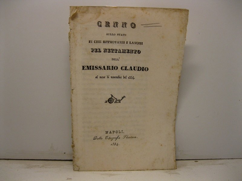 In 8, pp. 24. Br. rifatta. Saggio relativo ad 'una delle piu' importanti opere intraprese dal nostro provvido governo [che] e' lo spurgare l'emissario Claudio per dare novellamente scolo al lago Fucino nel fiume Liri, il che restituendo all'agricoltura oltre a quarantamila moggia di terra che da quelle acque vengono inondate'.