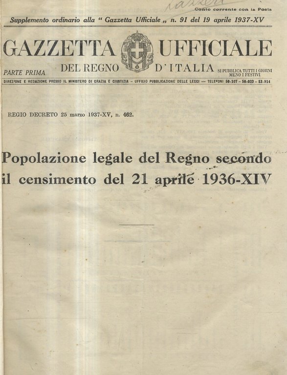 CENSIMENTO generale della popolazione del Regno. Tabella della popolazione residente, o legale, censita nei singoli Comuni del Regno al 21 aprile 1931-IX. R.D. 16 aprile 1932, n. 824. Unito: Popolazione legale del Regno secondo il censimento del 21 aprile 1936-XIV. R.D. 25 marzo 1937-XV, n. 462.