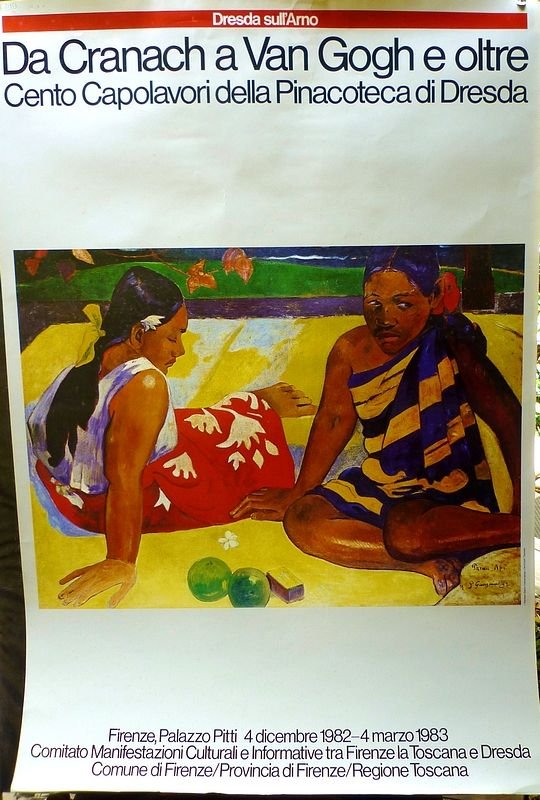 Grande manifesto di cm 100 x 67, raffigurante a colori un dipinto di Paul Gauguin. Mostra fatta a Firenze, Palazzo Pitti, 4 dicembre 1982 - 4 marzo 1983 (Dresda sull'Arno).