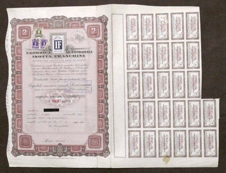 Certificato Azionario Fabbrica Automobili Isotta Fraschini - Due Azioni - 1947