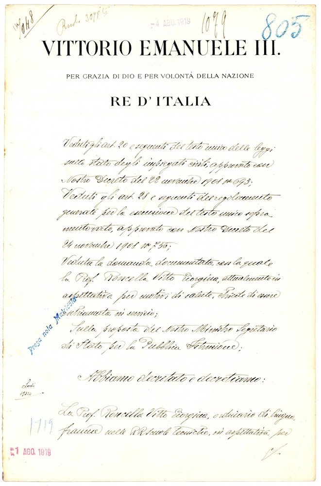 Foglio singolo di mm. 380x250. Intestazione e vari timbri di validazione e protocollo. Con il presente documento Vittorio Emanuele III concesse di rientrare in servizio, dopo un periodo di aspettativa per malattia, alla professoressa di francese delle RR Scuole Tecniche Giorgina Roncella Vitto con decorrenza dal 1° ottobre 1919.