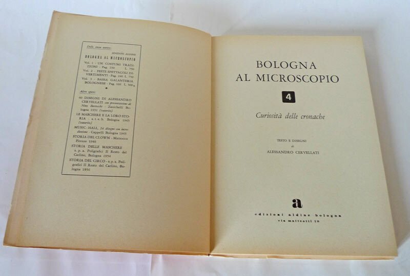 BOLOGNA AL MICROSCOPIO 4.Curiosità delle cronache.TESTO E DISEGNI diALESSANDRO CERVELLATI.Tamari Editori in Bologna, 1957,brossura, 21,5x15,5 cm., pp.210,numerose illustrazioni nel testo,peso: g.400CONDIZIONI DEL LIBRO: ottime INDICE Premessa...........................................................Pag. 7 1. Tra le mura della «grassa» Bologna. «L'anno uno» del XX secolo......................................................» 9 2. L'amore a 10 centesimi la parola...............................» 27 3. I misteri di Bologna: L'affare Cavagnati...................................... » 39 L'assassinio di Coltelli.......................................» 42 Il tagliatore di trecce........................................» 44 4. Curiosità delle cronache: Il processo delle tagliatelle....................... » 49 Avventura incredibile..........................................» 51 Altra avventura... bizzarra....................................» 53 Quando Otello ha ragione.......................................» 56 Bologna-Imola in vaporino......................................» 58 Licenze piacevoli..............................................» 60 La donna bolognese nel giudizio d’una signora ...» 63 Fattacci alla Certosa..........................................» 64 I comprimari...................................................» 66 Fine di un caffè...............................................» 68 Addio, canale di via Riva Reno.................................» 70 Un monumento all'erba..........................................» 72 Funamboli e aviatori...........................................» 73 La Fanciulla del West..........................................» 77 Frine..........................................................» 79 Fiere ed altro alla Montagnola.................................» 81 L’ingegnere Ceri...............................................» 84 Donne in pantaloni.............................................» 86 Fatti edificanti...............................................» 87 Agosto galeotto................................................» 90 Fatti che succedono qualche volta..............................» 95 Fatti di tutti i tempi.........................................» 97 Codicillo alla bassa galanteria................................» 98Teatri scomparsi:Teatro Verdi....................................................Pag. 111Teatro Apòllo...................................................» 117Teatro della Nosadella..........................................» 120Immortalità della Duse..........................................» 123Dina Galli all'Arena del Sole...................................» 127Fanny Cerrito a Bologna . . .......................» 131Ricordo di Giuseppe Verdi.......................................» 135Gobatti e i suoi Goti...........................................» 139Ricordo di Angelo Cuccoli.......................................» 147Collera dannunziana contro Testoni..............................» 153Ladri e truffatori geniali......................................» 157Arti divinatorie................................................» 165Parole furbesche................................................» 173I borghigiani...................................................» 177Natale e Pasqua d’altri tempi...................................» 185Quando c'era il «San Michele»...................................» 189Statue e giardini...............................................» 193Restano tre fiacres.............................................» 199Bologna turistica ..............................................» 205