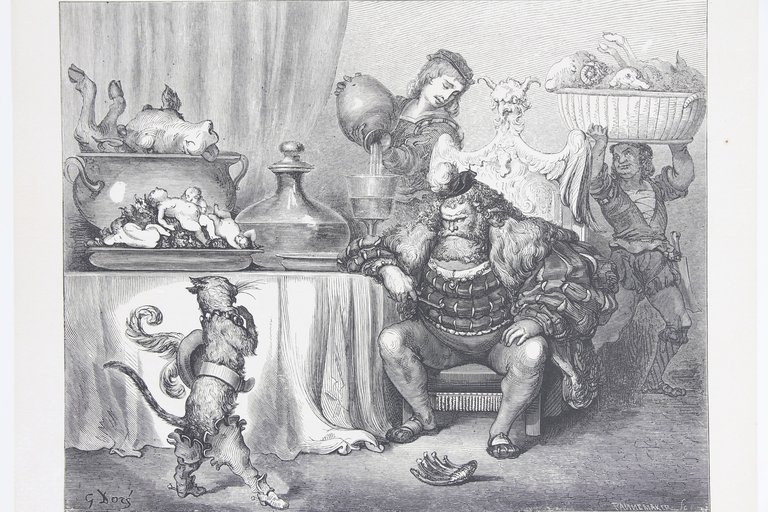 Charles Perrault, Contes, Le Chat botté, L'ogre le reçut aussi civilement que le peut un ogre - Gravure originale sur bois debout, tirée sur chine et contrecollée sur vergé de Hollande