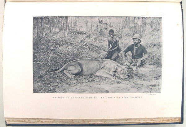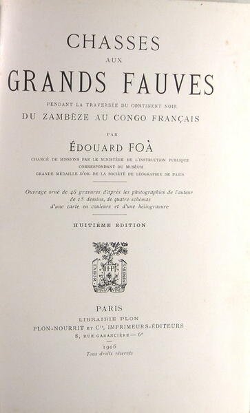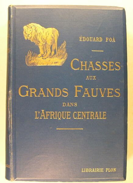 Paris, E. Plon, Nourrit et Cie, Imprimeurs-Editeurs, 1906. Grand In/8, reliure percaline éditeur bleu roi, plat à décor (lion) et titres dorés, doré sur tête, frontispice le portrait de l'auteur, 352 pages, une carte dépliante en couleurs in-fine (traversée de l’Afrique équatoriale), 46 gravures d’après les photographies de l’auteur, 15 dessins, 4 schémas, huitième édition. Coiffes amorties. Plats frais. Plaisant ouvrage, l’un des plus attrayants, sur les grandes chasses africaines, qui ne contient pas moins de quatorze chapitres, parmi lesquels : Armes et équipement de chasse ; en pleine jungle, à la poursuite des grands animaux ; région inexplorée ; géants sur le déclin ; le loup africain ; les chiens d'Europe ; quelques moeurs de l'éléphant, du rhinocéros, du lion ; nuit d'affût en 1895. . Thiébaud col. 406.