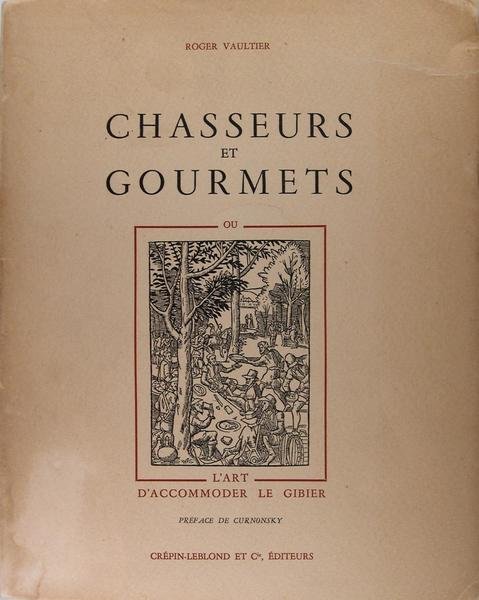 Crépin-Leblond et Cie, Editeurs, 1951. In/4 broché, couverture illustrée, 256 pages, illustré de reproductions dans le texte d’estampes, gravures et vignettes anciennes. Tirage à 2500 exemplaires numérotés, celui-ci sur fleur d’alfa. Edition originale. Couverture légèrement insolée. Un livre de recettes précieuses, des plus rares et des plus fines, de gibier à plumes, à poils et venaison ; Sauces ; Fonds et fumets ; Les vins et le gibier. Préface de Curnonski. Mouchon, 1264.