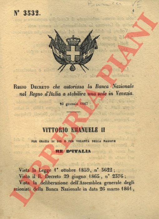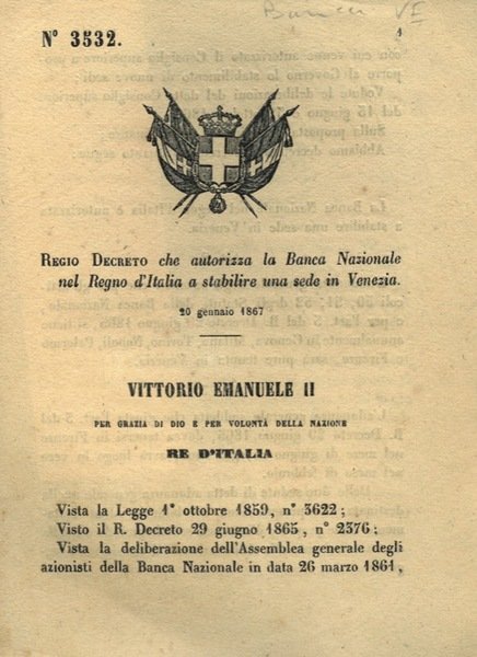 che autorizza la Banca Nazionale nel Regno d'Italia a stabilire una sede in Venezia.
