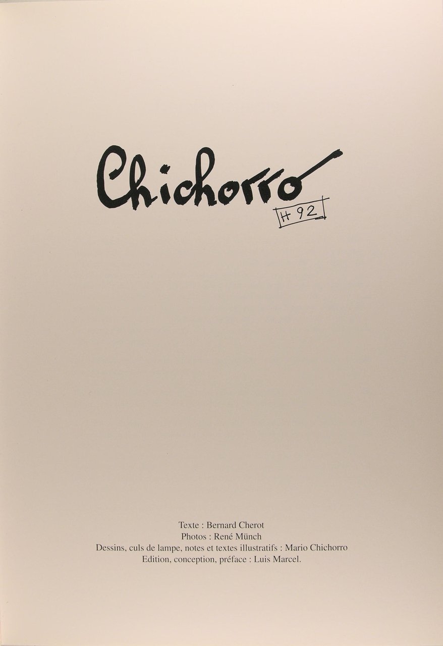 Ambierle Loire, 1994, grand in/4, reliure éditeur, 285 pages. Photographies en couleurs de René Münch, dessins cul de lampe, notes et textes illustratifs de Mario Chichorro, édition, conception, préface de Luis Marcel. "Mario Chichorro, figure reconnue dans le milieu de l’art brut, à l’âge de 90 ans, à Thuir, dans les Pyrénées-Orientales, où il résidait. Cet artiste dont le travail était reconnu par Jean Dubuffet en personne, le fondateur de l’art brut, et, plus près de lui, par le catalan Claude Massé, était né au Portugal en 1932, et avait étudié l’architecture aux Beaux-Arts de Porto. Mais il avait ensuite fuit son pays dirigé par des militaires pour arriver en France en 1963 où il s’installe à Perpignan, embauché par un architecte. En 1968, il choisit de se consacrer à la peinture et passera le reste de sa vie à peindre, dessiner ou sculpter, essentiellement des visages, notamment avec son matériau favori, le polystyrène."
