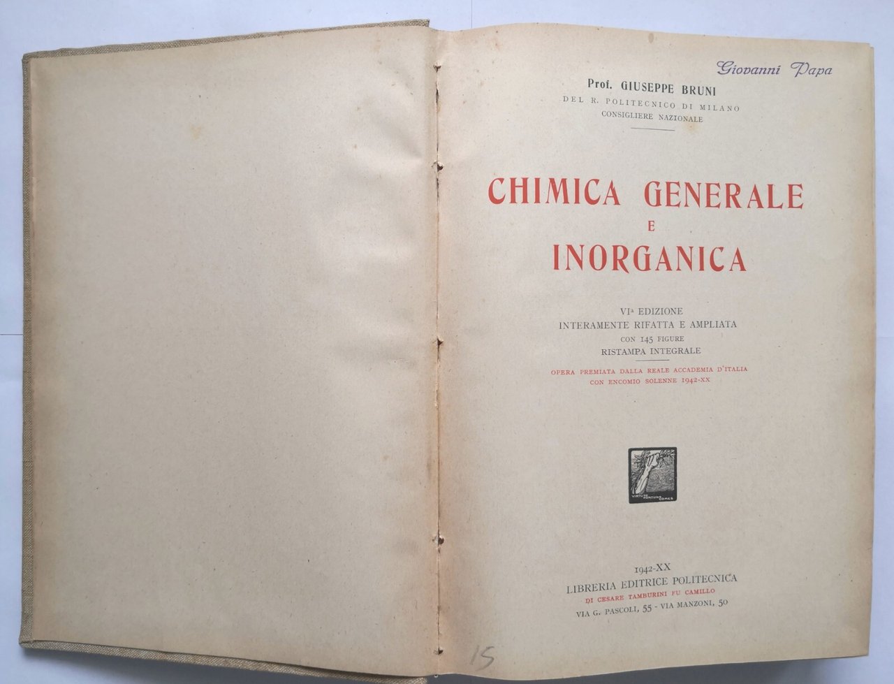 CHIMICA GENERALE E INORGANICA di Giuseppe Bruni 1942 Politecnica libro manuale