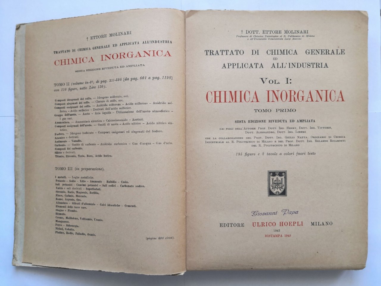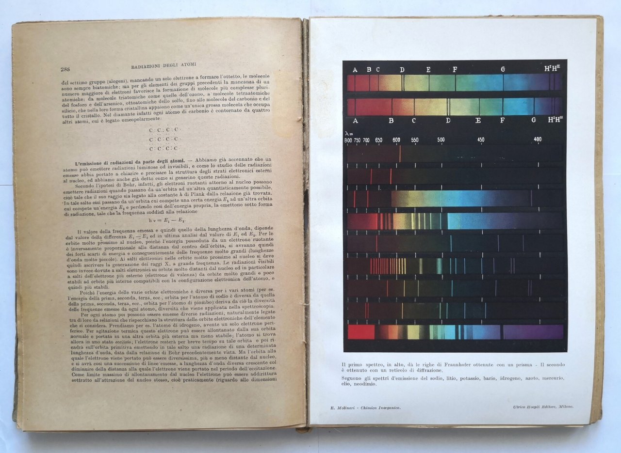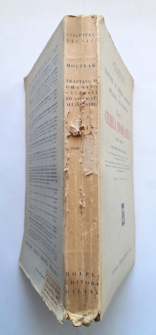 Trattato di chimica generale ed applicata all'industria. Volume I - CHIMICA INORGANICA Tomo I di Ettore Molinari. Editore Ulrico Hoepli, 1945. XX, 597 pagine, 185 figure in bianco e nero nel testo, 2 tavole a colori fuori testo. Copertina editoriale in brossura. Stato di conservazione: buono (pagine ingiallite, piccole mancanze al dorso) Libro usato saggistica
