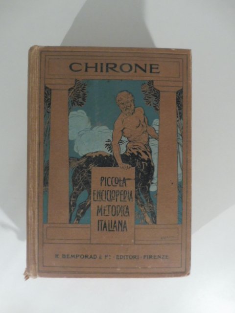 In 16 cm. 19,5 x 13,5, pp. XVI + 1004 con 391 figure, saggi di musica in bianco e nero nel testo e una carta geografica a colori fuori testo. Rilegatura in tutta tela color rame chiaro illustrati in color rame chiaro/nero/azzurro e con titoli in oro al dorso. L'illustrazione del piatto anteriore raffigura il centauro Chirone che regge il titolo del volume entro cornice a colonne doriche, quella del piatto posteriore i rami di due alberi fasciati con nastro recante il titolo del volume. Sguardie con ornamento floreale marrone su fondo lilla, tagli rossi. Leggero stato d'uso della copertina, piccola mancanza alla sguardia anteriore.
