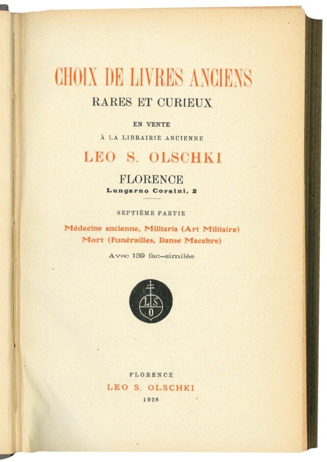 Choix de livres anciens, rares et curieux en vente a la librairie ancienne Leo S. Olschki. Septieme partie. Medecine ancienne. Militaria. Art militaire. Mort. Funerailles, danse macabre.