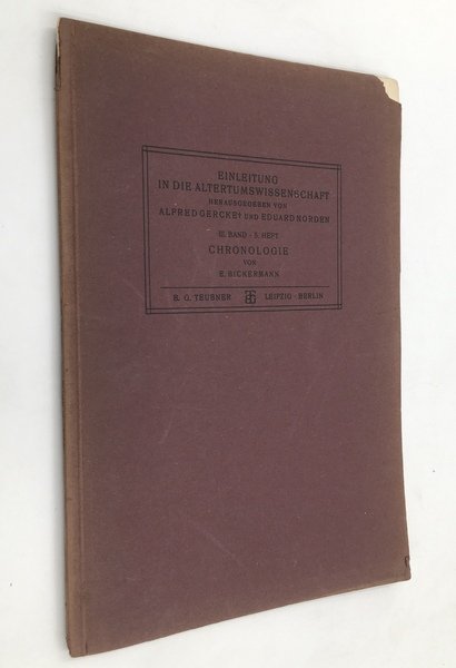"Einleitung in die Altertumwissenschaft" herausgegeben von Alfred Gercke und Eduard Norden unter Mittwirkung Zahlreicher Fachgenossen. III. Band, 5. Heft, del tutto a sé stante. In-8° (cm. 24,8), pp. 43 con 2 FIGURE ASTRONOMICHE b.n. e 1 TABELLA nel testo. Cartoncino leggero editoriale, angoletto mancante al piatto anteriore. Inoltre: anno ciclico, calendario ateniese, calendario macedone in Egitto, anno egizio, calendario romano, calendario giuliano, la settimana, cronografia. denominazione dell'anno, Die Indiktion, Die Grundlagen der Reduzierung, Bibliogr., cenni pratici]. BICKERMAN, emigrato dalla Russia, studiò nella Humboldt Universität di Berlino; storico dell'antichità, studioso in particolare della cultura giudeo-ellenistica. Nel 1933 esule a Parigi, poi a Marsiglia