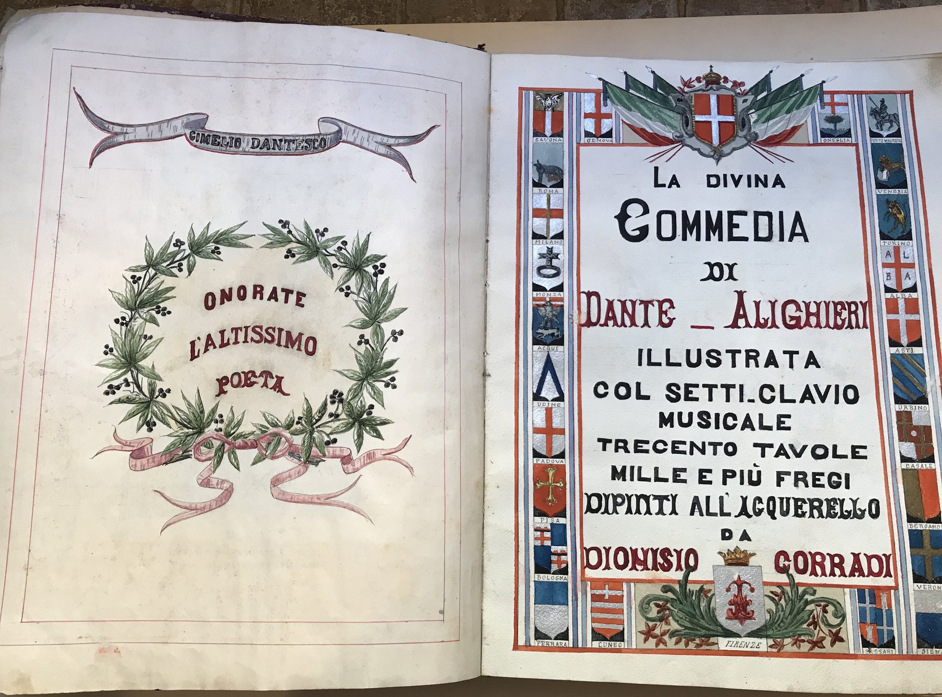Cimelio dantesco: la Divina Commedia di Dante Alighieri illustrata col setti-clavio musicale, trecento tavole, mille e più fregi dipinti all'acquerello da Dionisio Corradi