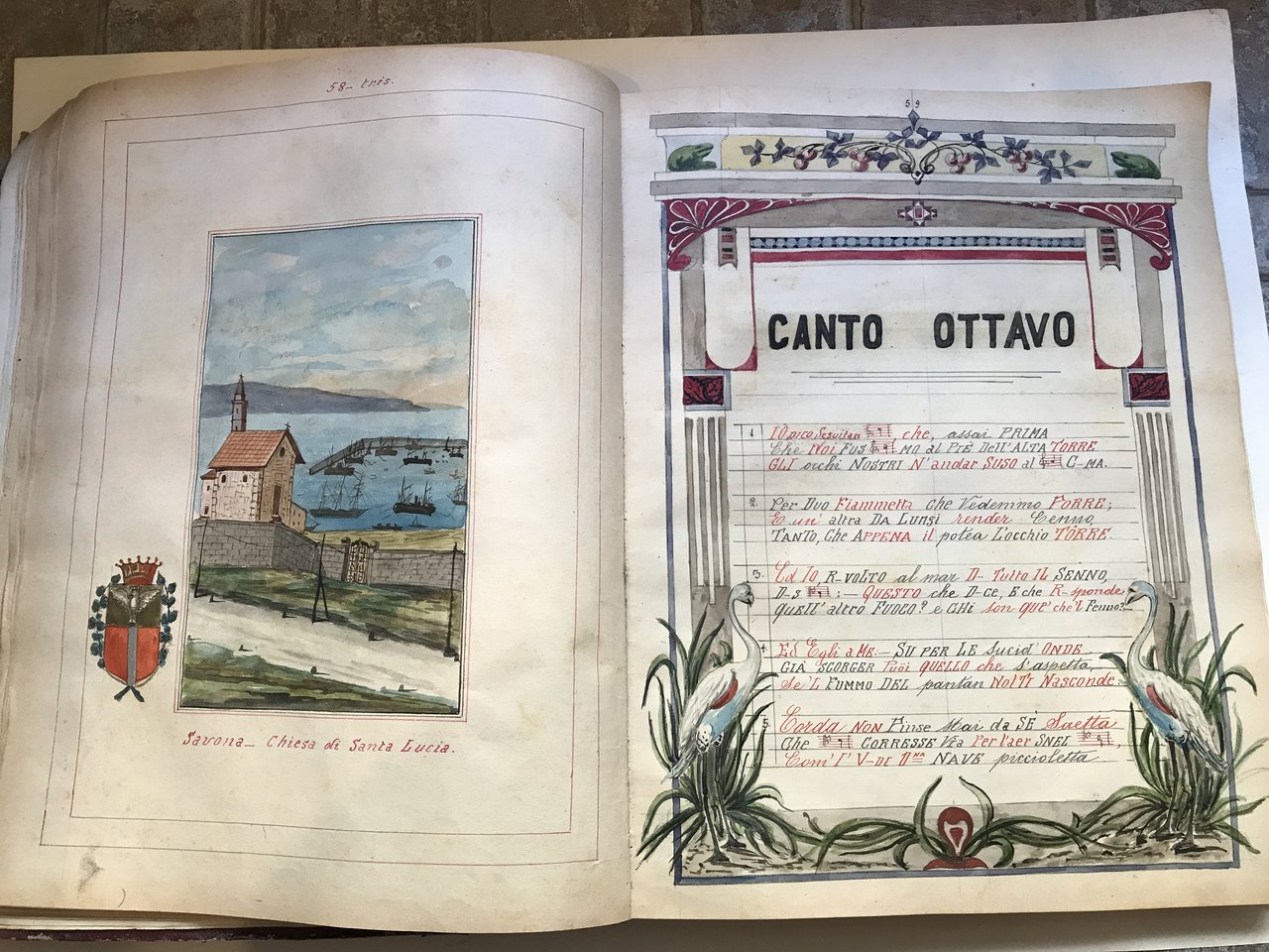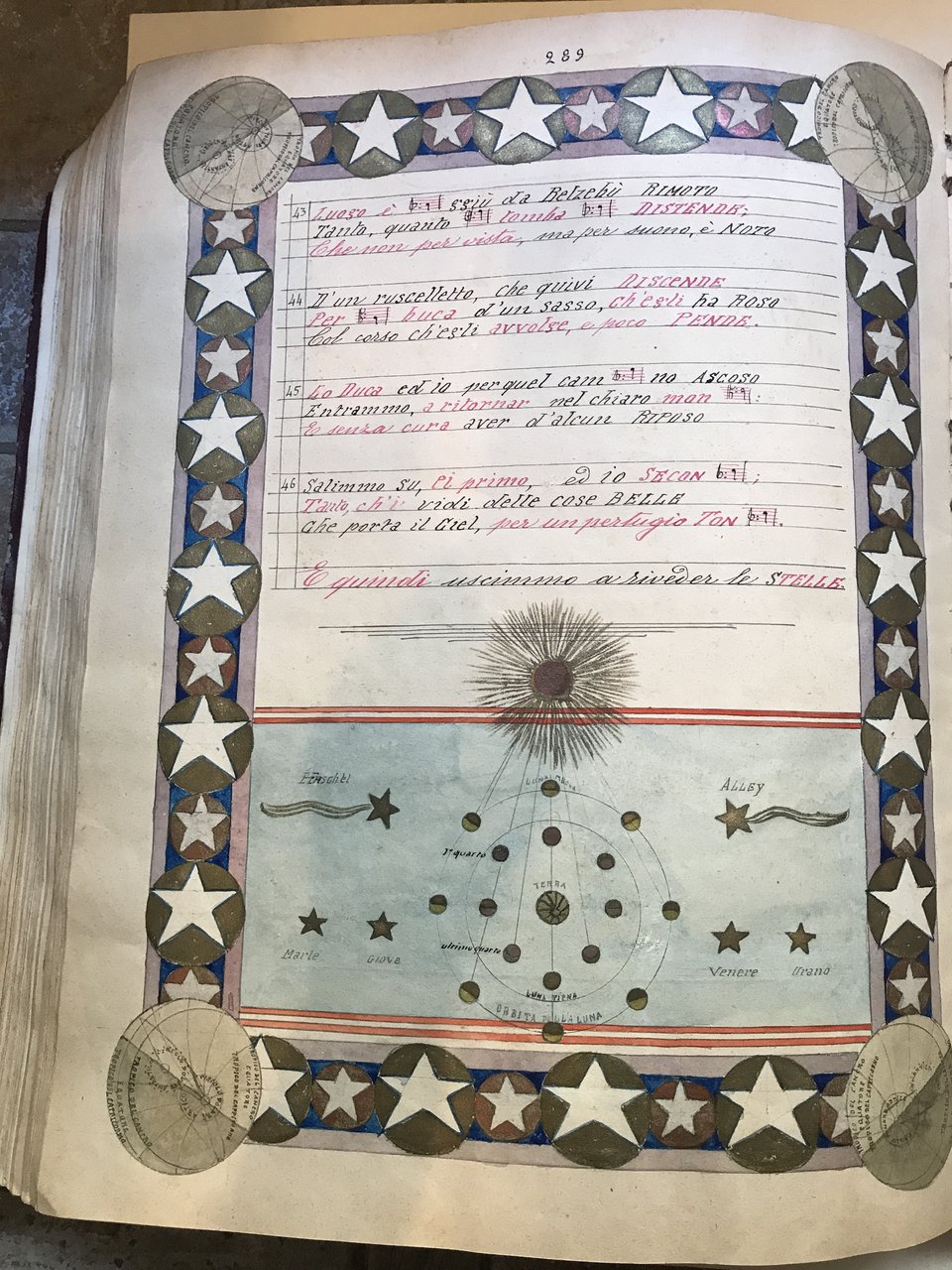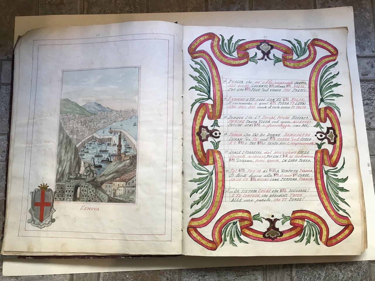 In folio (400 x 310 mm), manoscritto su carta di 290 pagine interamente dipinte all'acquerello contenenti i 34 canti dell'Inferno dantesco scritti ad inchiostro rosso e nero con sostituzione di alcune sillabe con il setti-clavio musicale appropriato. Ritratto dell'autore del cimelio e ritratto di Dante. Il testo è racchiuso in splendide cornici a motivi floreali, geometrici, fitomorfici, sempre differenti. Tra un canto e l'altro si trovano intercalate 30 acquerelli a piena pagina raffiguranti le città liguri che molto probabilmente Dante dovette attraversare durante il suo viaggio da Firenze a Parigi (Firenze, Genova, Cornigliano e Sestri Levante, Voltri e Arenzano, Cogoleto, Varazze e Celle, Albissola, Savona, Vado e Spotorno, Noli e Finale, Loano e Ceriale, Albenga, Alassio, Laigueglia, Andora e Cervo, Diano Marina, Oneglia, Porto Maurizio, San Lorenzo, Riva e Taggia, Sanremo, Ospedaletti e Bordighera, Ventimiglia, Mortola, Ponte di San Luigi, Mentone, Turbia, Nizza), 74 acquerelli a piena pagina raffiguranti personaggi famosi e raffigurazioni di scene tratte dal testo dantesco. Legatura in carta, ai piatti duplice cornice geometrica in oro con agli angoli motivi floreali e al centro titolo dell'opera, purtroppo la legatura presenta diverse usure e anche l'oro utilizzato ha perso la sua lucentezza. L'interno fresco. All'ultima pagina Il Corradi dichiara di aver iniziato il suo lavoro il 2 marzo 1919 e terminato 13 settembre 1922