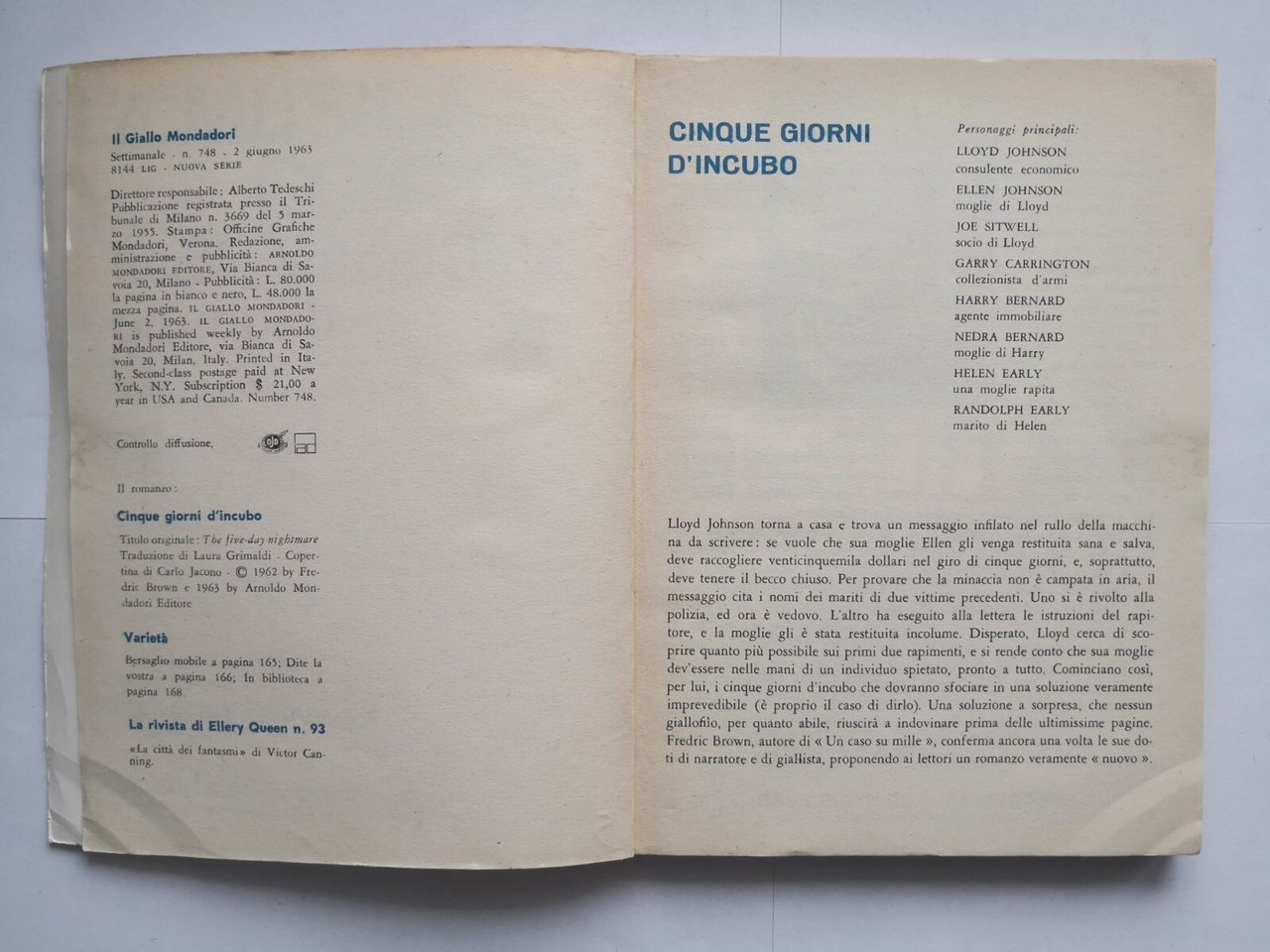 CINQUE GIORNI D'INCUBO di Fredric Brown. "Il giallo Mondadori" Numero 748.