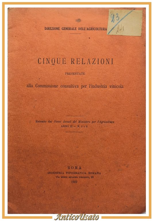 CINQUE RELAZIONI PRESENTATE ALLA COMMISSIONE PER L'INDUSTRIA VINICOLA 1922 Libro