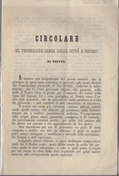 16 p., 23 cm. Condizioni : USATO - Stato : Buono. Altre note : Data di stampa dalla data di emanazione in calce: Trento, 2 marzo 1864 In calce a p. 16: N.° 778/161 Benef. La circolare tratta del Regolamento generale intorno ai cinque corsi di studio privato generale, Schemi di elaborati italiani in base al programma, Programma dei singoli oggetti da trattarsi nei cinque corsi di studio privato.