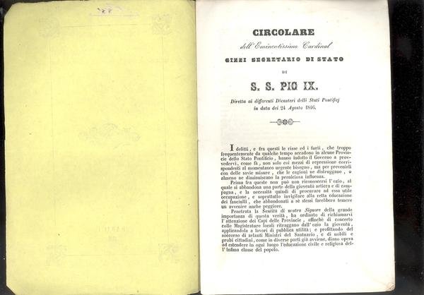 CIRCOLARE DELL'EMINENTISSIMO CARDINAL GIZZI SEGRETARIO DI STATO DI S. S. PIO IX<BR>DIRETTA AI DIFFERENTI DICASTERI DELLI STATI PONTIFICI IN DATA DEI 24 AGOSTO 1846.