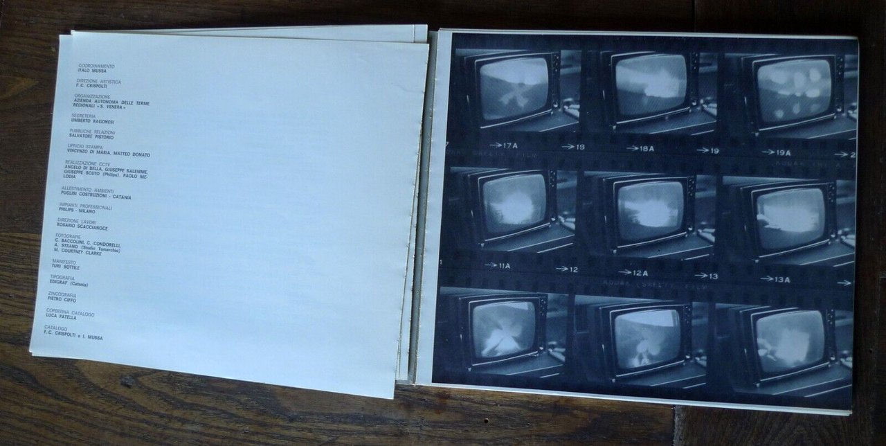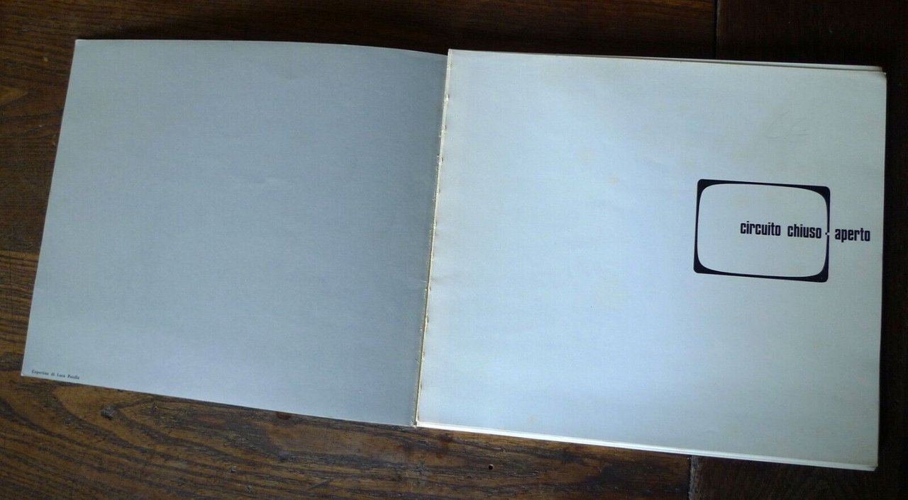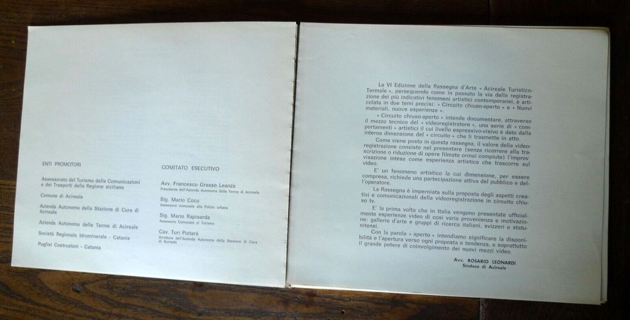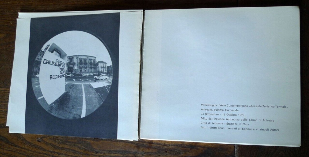 CIRCUITO CHIUSO APERTO.VI Rassegna d'Arte Contemporanea"Acireale Turistico-Termale".Acireale, Palazzo Comunale,24 settembre - 15 ottobre 1972Coordinamento: Italo Mussa.Direzione artistica: F.C. Crispolti.Edito dall'Azienda Autonoma delle Terme di Acireale,Acireale (CT) 1972,brossura, 24x21 cm., pp.92 non numerate,illustrazioni fotografiche in bianco e nerotratte dalle opere video di Betty La Rocca, Vincenzo Agnetti, Gianni Colombo, Gelard Minkoff, Claudio Ciutoli, Luca Patella, Mimmo Paladino , Tomaso Binga, Turi Sottile, M. Tesesa Corvino,peso: g.400
