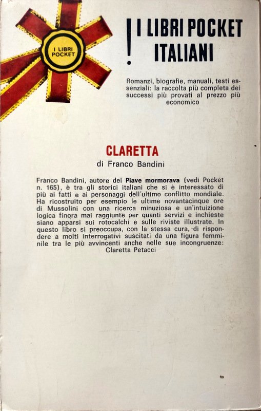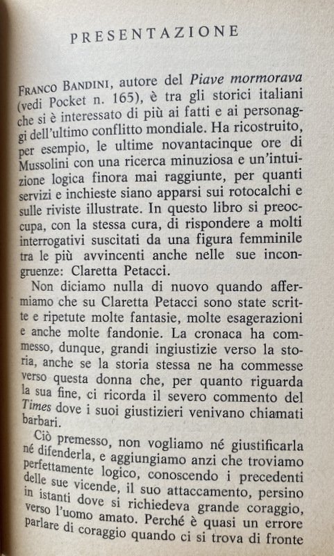 Franco Bandini, autore del Piave mormorava, è tra gli storici italiani che si è interessato di più ai fatti e ai personaggi dell'ultimo conflitto mondiale, ha ricostruito per esempio le ultime novantacinque ore di Mussolini con una ricerca minuziosa e un'intuizione: logica finora mai raggiunte per quanti servizi e inchieste siano apparsi sui rotocalchi e sulle riviste illustrate. In questo libro si preoccupa, con la stessa cura, di rispondere a molti interrogativi suscitati da una figura femminile tra le più avvincenti anche nelle sue incongruenze: Claretta Petacci.