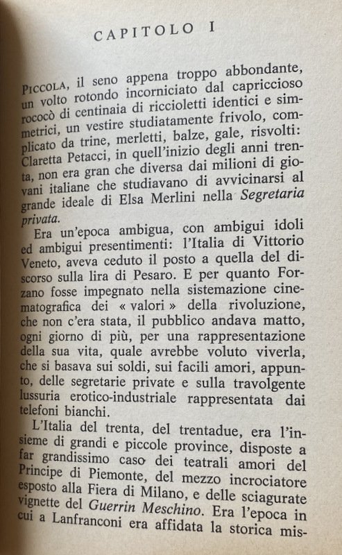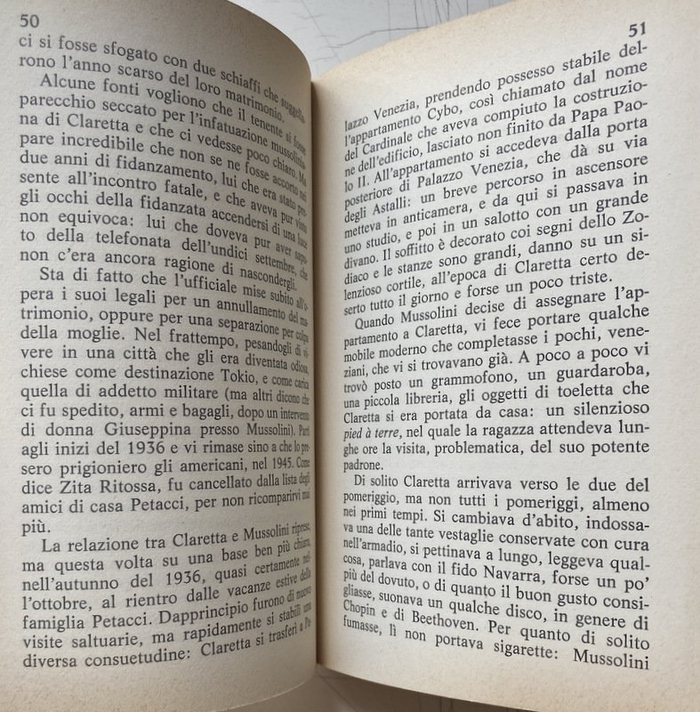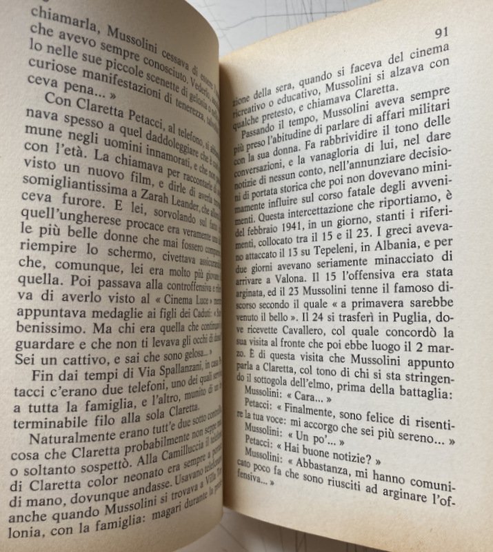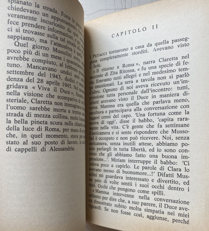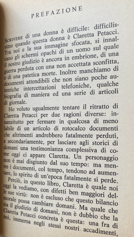 Soggetti: Biografie femminili, Donne influenti, Storia contemporanea, Claretta Petacci, Benito Mussolini, Amanti, Duce, Fascismo, Dongologi, Segreti, Dongo, Fuga, Amore, Lago di Como, Renzo De Felice, Storiografia, Saggi storici, Marcello Staglieno, Fabio Andriola, Luciano Garibaldi, Le ultime 95 ore, Nazismo, Tedeschi, Adolf Hitler, Politica estera, Seconda Guerra Mondiale, Cronache, Eventi, Dialoghi privati, Reportage, Resistenza, Partigiani, Revisionismo storico, Verità, Menzogne, Vulgata, Vita e morte segreta, Piazzale Loreto, Fucilazione, Servizi segreti, Inglesi, Winston Churchill, Corrispondenza, Epistolario, Lettere, Diario, Galeazzo Ciano, Edda Ciano, Inghilterra, Germania, Americani, Sbarco, Alleati, 8 Settembre, Armistizio, Badoglio, Liberazione, Indagini, Inchieste, Via Regina, Menaggio, Oro, Tesoro, Walter Audisio, Colonnello Valerio, Aldo Lampredi Guido, Michele Moretti Pietro, Omicidio, Uccisione, Assassinio, Testimonianze, Cadaveri, Corpi, Villa Belmonte, Mitra, CLNAI, Pertini, Valiani, Cattura, Plotone, Esecuzione, Fascisti, Martiri, Muti, Rappresaglia, Attentati, Gappisti, Italo Pietra, Luchino Dal Verme, Alberto Mario Cavallotti, Alfredo Malgeri, Oltrepò Pavese, Alfredo Mordini, Riccardo, Fiat 1100, Dante Gorreri, PCI, Signor X, Taccuini, Luigi Longo, Brigate Garibaldi, Partito Comunista, Luigi Canali, Capitano Neri, Giuseppina Tuissi Gianna, Missioni, Dongologia, Terzo livello, Faccetta nera, Profilo atorico, Ritratti, Arrigo Petacco, Collezionismo, Libri Vintage fuori catalogo, Riferimento, Consultazione, Bibliografia, Classici, Giudizio, Intercettazioni telefoniche, Documenti, Interrogativi, Times, Giornalismo d'inchiesta, Regime fascista, Ventennio, Eva Braun, Mogli, Dittatura, Illazioni, Fantasie, Ricostruzioni, Personaggi illustri, Chiesa, Concordato, Pied à terre, Navarra, Papa Paolo II, Elsa Merlini, Miriam, Ferruccio Lanfranchi, Duilio Susmel, Gerarchie, Capi, Giolitti, Marina militare, Esercito, Sconfitta, Myriam, Milano, Roma, Cavallero, Famiglia, Affetti, Valona, Albania, Cinema Luce, Gravidanza, Aborto, Riccione, Cognata, Marcello, Chamberlain, Halifax, Europe Nouvelle, Giuseppina, Villa Torlonia, Telefonate, Libia, Tripoli, Africa, Fine, Morte, Relazioni amorose, Palazzo Venezia, Margherita Sarfatti, Rachele Guidi, Gerarchi, Repubblica, Salò, Franz Spögler, Emilio Gentile, Missive, Processo di Verona, Giulino di Mezzegra, Carteggio, Mercutio, Matrimonio, Riccardo Federici, Sacra Rota, Curiosità, Aneddotica, Brutus, L'ultima favorita, Angelo Colleoni, Rivelazioni, Richard Collier, Luigi de Vincentis, Roberto Gervaso, Duilio Susmel, Macelleria messicana, Miria di San Servolo, Zita Ritossa, Female biographies, Influential women, Contemporary history, Lovers, Fascism, Dongologists, Secrets, Dongo, Escape, Love, Lake, Historiography, Historical essays, The last 95 hours, Nazism, Germans, Foreign policy, Second World War, Chronicles, Events, Private dialogues, Resistance, Partisans, Revisionism, Truth, Lies, Vulgate, Secret life and death, Shooting, Secret services, English, Correspondence, Epistolary, Letters, Diary, England, Germany, Americans, Landing, Allies, 8 September, Armistice, Liberation, Investigations, Investigations, Gold, Treasure, Homicide, Killing, Assassination, Testimonies, Corpses, Bodies, Machine Gun, Capture, Platoon, Execution, Fascists, Martyrs, Retaliation, Attacks, Notebooks, Brigades, Communist Party, Missions, Dongology, Third level, Black face, Historical profile, Portraits, Collecting, Out-of-print books, Reference, Consultation, Bibliography, Classics, Judgement, Telephone tapping, Documents, Questions, Investigative journalism, Wives, Dictatorship, Illations, Fantasies, Reconstructions, Illustrious personalities, Church, Pope Paul II, Hierarchies, Leaders, Navy, Army, Defeat, Milan, Rome, Family, Affections, Pregnancy, Abortion, Sister-in-law, Phone calls, Libya, End, Death, Love affairs, Venice Palace, Hierarchs, Republic, Missives, Process, Correspondence, Marriage, Curiosity, Anecdotes, The last favourite, Revelations, Mexican butcher's shop, Lux