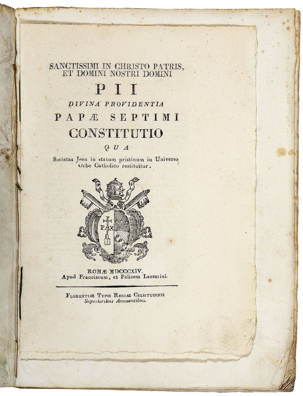 PIO VII (Barnaba Niccolò Maria LuigiChiaramonti, 1742-1823). Sanctissimi in Christo Patris et Domini nostri Domini […] Pii Divina Providentia Papæ septimi Constitutio qua Societas Jesu in statum pristinum in Universo Orbe Catholico restituitur. Romae, apud Francisum, et Felicem Lazzarini, Florentiæ, Typis Regiæ Celsitudinis, 1814 [Datum Romae apud Sanctam Mariam Majorem Anno Incarnationis Dominicae Millesimo Octingentesimo Quartodecimo Septimo Idus Augusti Pontificatus Nostri Anno quintodecimo].
