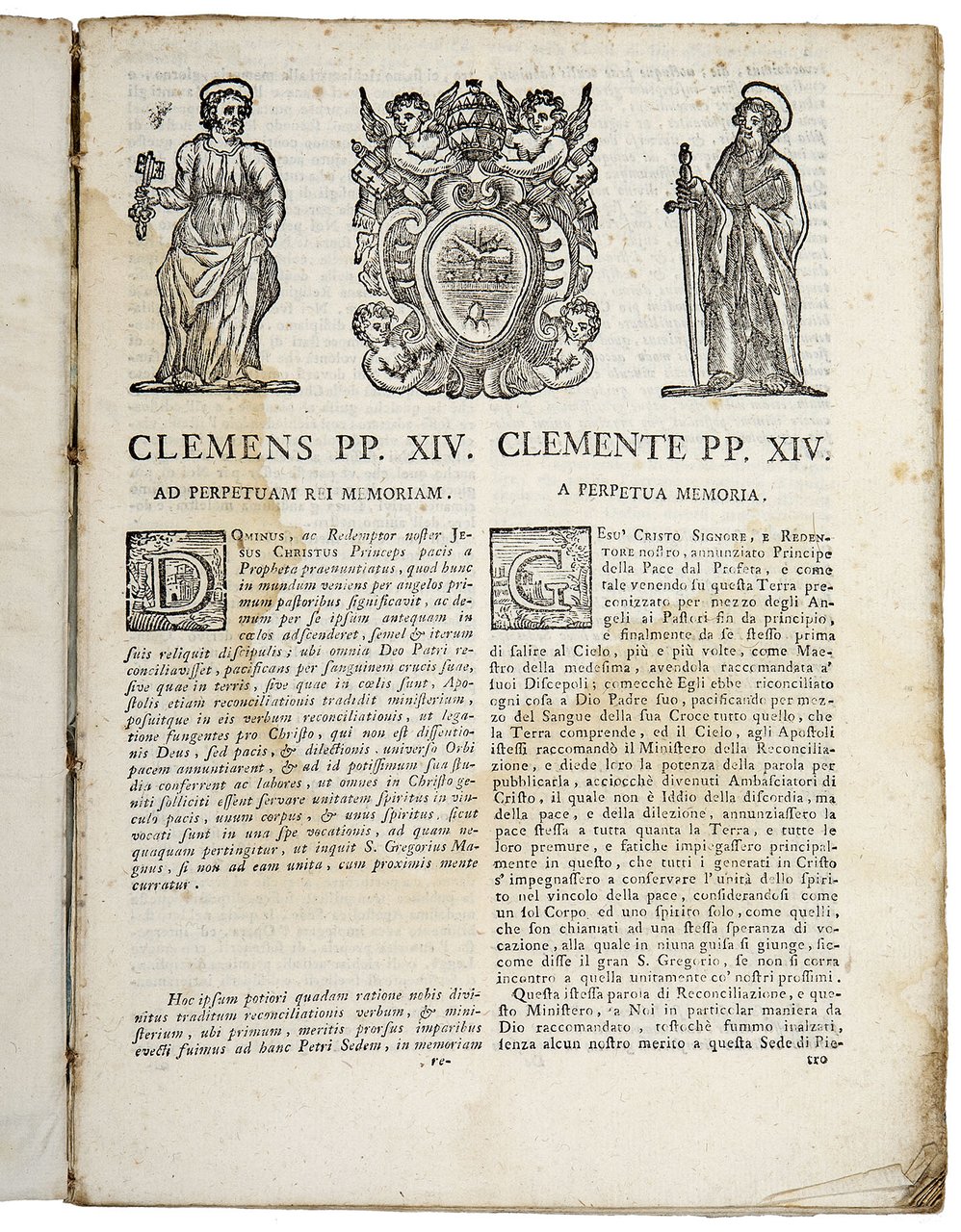 In 4to (mm. 245x180). Pp. 23, [1]. Segnatura: A8 B4. Stemma di Clemente XIV inciso in legno tra l'effigi dei Santi Pietro e Paolo. Iniziali ornate. Testo stampato su due colonne in latino ed in italiano. A c. B3r inizia il breve Clemens PP. XIV. Ad perpetuam rei memoriam. Gravissimis ex causis nuper Nos…, emanato il 13 agosto 1773 e firmato in calce A. Card. Nigronius. Lievi fioriture marginali, leggero alone nella parte inferiore dell'opera.