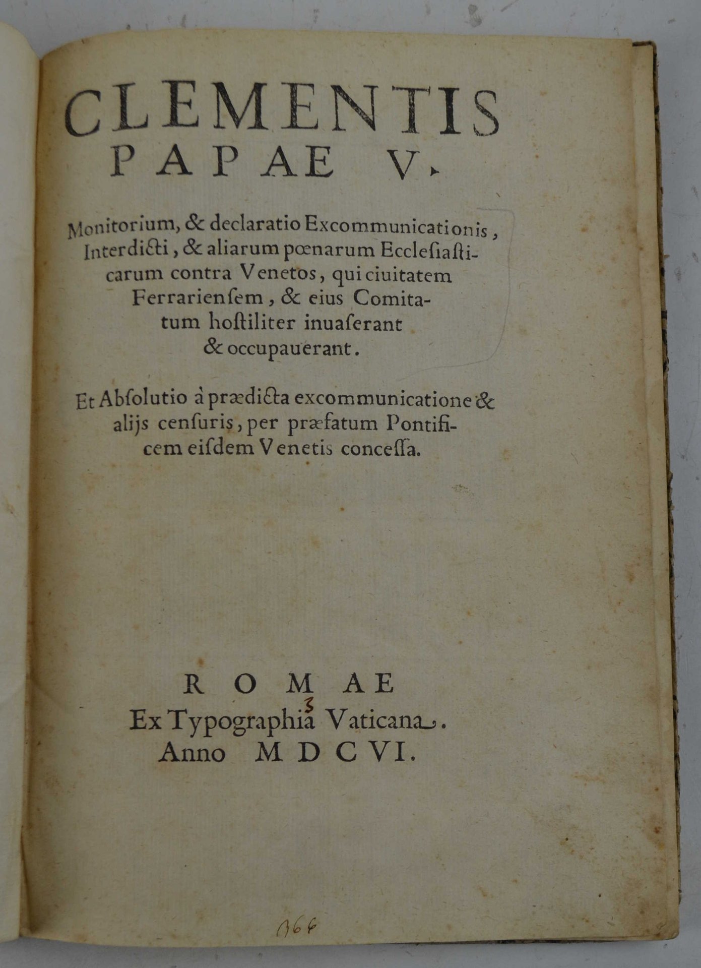 Cm. 24, pp. 23 (5). Unito a: Sixti Papae III Declaratio… S.n.t. Pp. 20. Unito a: Iulii Papae II Monitorium… S.n.t. Pp. 20, 14, 4. Legatura posteriore in cart. decorato. Qualche traccia d'uso al dorso, peraltro ben conservato.