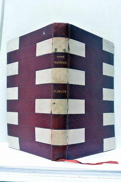10 feuillets. Page de titre imprimée en rouge et noir. 286 pages. (22,5x22,5 cm). Reliure en cuir rouge et blanc. Coins un peu émoussés. Dos lisse avec nom d'auteur et titre doré. Petits accidents au dos. Edition limitée à 3500 exemplaires dont celui-ci est le nº 108 des 275 exemplaires imprimés sur vélin pur fil. "Climats" est consideré par des nombreux lecteurs comme l'ouvrage le plus représentatif du talent de romancier d'André Maurois. Il s'agit de l'histoire de Philippe Marcenat, fils de grands bourgeois limousins conventionnels et rigides, qui s'éprend passionnément de la ravissante Odile Malet et l'épouse malgré l'hostilité de ses parents. Son mariage sera un échec. Remarié à Isabelle de Cheverny, qui est le contraire absolu d'Odile, et bien que l'aimant profondément, c'est lui maintenant qui fait subir à Isabelle les tourments qu'il a éprouvés jadis. Histoire d'un double échec conjugal d'une finesse psychologique exceptionnelle. Couverture d'origine conservé. Exemplaire en très bon état.