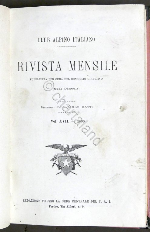 Club Alpino Italiano - C. Ratti - Rivista mensile Vol. XVII - Anno completo 1898 Pag. 556 con alcune illustrazioni Copertina rigida - Testo in italiano. Condizioni molto buone. Copertina come da foto.