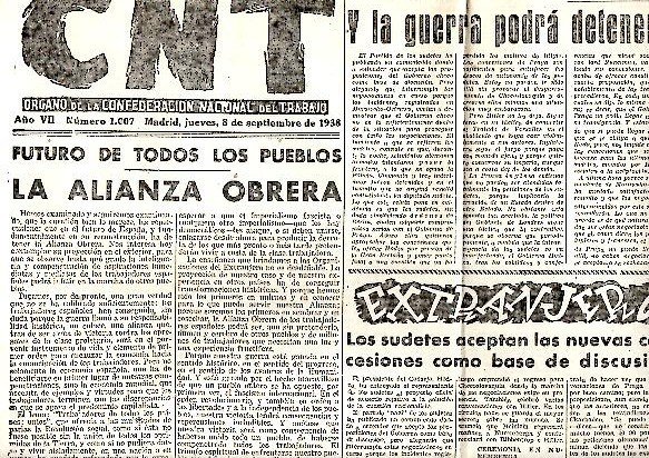 CNT. ORGANO DE LA CONFEDERACION NACIONAL DEL TRABAJO. AÑO VII. N. 1007. 8-SEPTIEMBRE-1938.