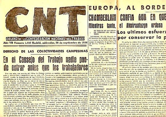 CNT. ORGANO DE LA CONFEDERACION NACIONAL DEL TRABAJO. AÑO VII. N. 1025. 28-SEPTIEMBRE-1938.