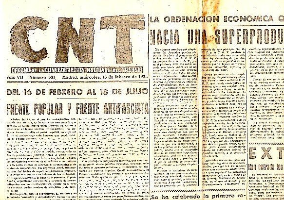 CNT. ORGANO DE LA CONFEDERACION NACIONAL DEL TRABAJO. AÑO VII. N. 831. 16-FEBRERO-1938.