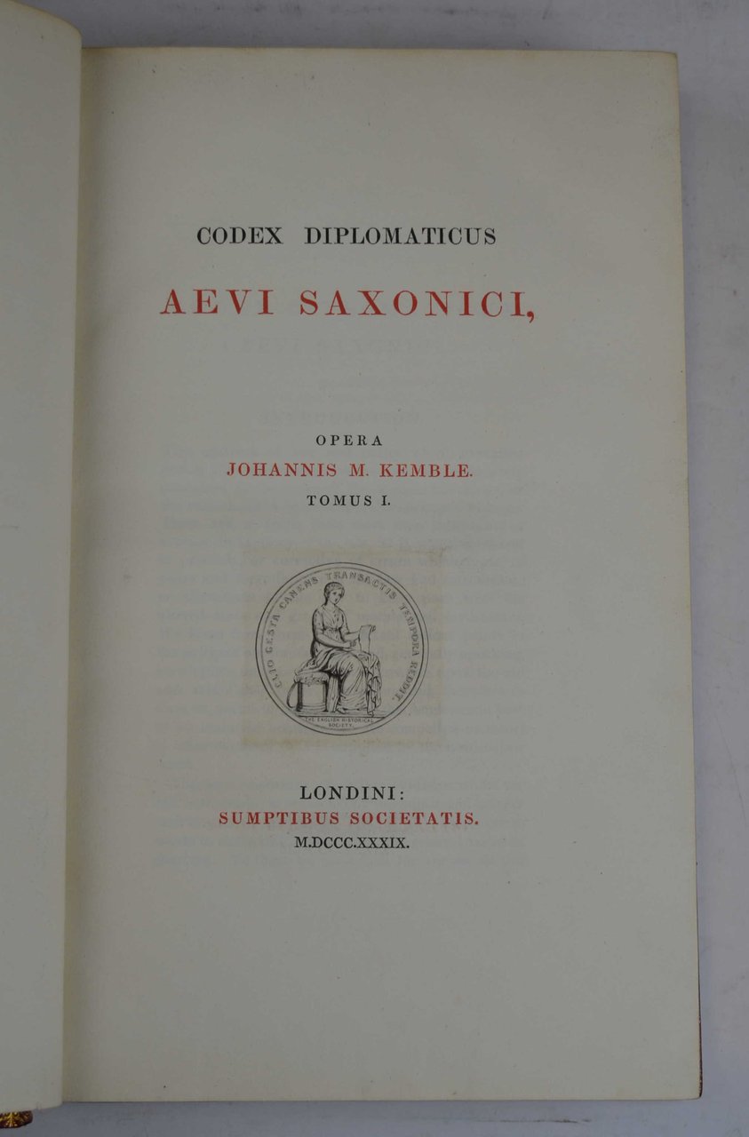 Sei volumi di cm. 25, pp. 3.000 ca. complessive. Vignetta incisa a ciascun frontespizio. Solida ed elegante legatura coeva in pieno marocchino rosso, dorsi a nervi con titoli su doppio tassello e ricchi fregi ai comparti. Piatti inquadrati da triplo filetto dorato, dentelles interne, tagli in oro e sguardie marmorizzate. Esemplare particolarmente fresco, marginoso e ben conservato. E' presente a ciascun volume un ex libris nobiliare inglese. Edizione originale ed unica di quest'opera che contiene ben 1400 documenti riguardanti la storia anglo-sassone.