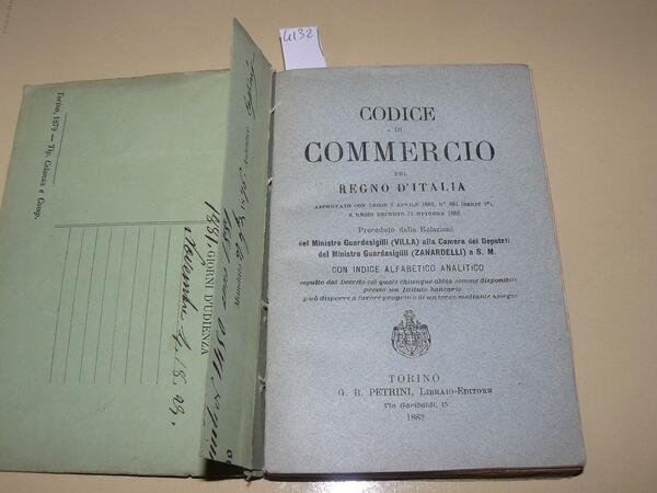 Codice di commercio del Regno d'Italia approvato con legge 2 aprile 1882 n. 681 (serie 3°) e Regio Deecreto 31 ottobre 1882. proceduto da relazioni del Ministro Guardasigilli (Villa) alla Camera dei Deputati del Ministro Guardasigilli (Zanardelli) a S.M. con indice alfabetico analitico seguito dal Decreto col quale chiunque abbia somme disponibili presso un istituto bancario può disporre a favore proprio o di un terzo madiante assegni