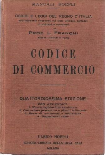 in 16°, pp. 334, leg. edit. con tit. in nero. 'Codici e Leggi del Regno d'Italia' 14^ ediz. 'Con appendici: 1 - Nuova legislazione cambiaria; 2 - Concordato preventivo e piccoli fallimenti; 3 - Borse di commercio e mediazione; 4 - Disposizioni varie'. Ottimo. 584/38