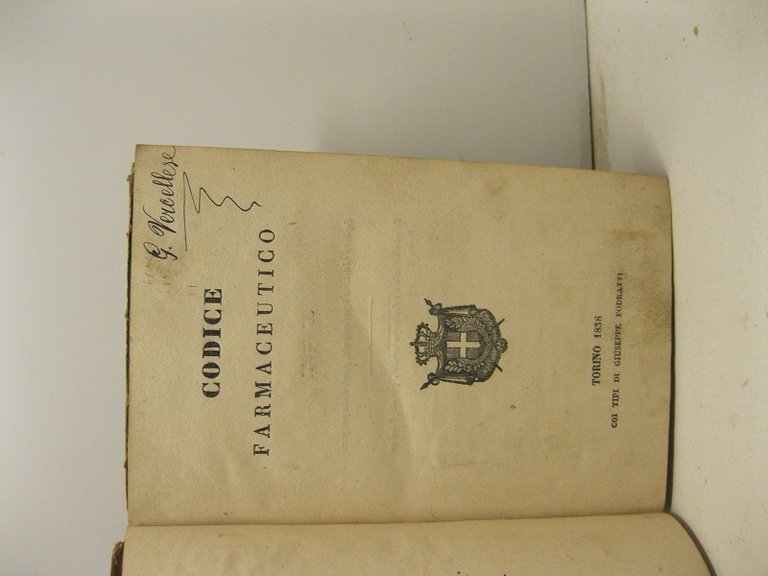 In 8, pp. 333 + (1). Spelature ai piatti e dorso rifatto Nel complesso solido esemplare. Firma di propr. al f. Edizione originale di questo testo che nasce come codice farmaceutico militare anche se in questo esemplare la dicitura 'militare' non compare sul frontespizio. Nonostante cio' il testo risulta identico agli esemplari che portano l'indicazione 'militare'. La prima parte si occupa della materia medico - farmaceutica, la seconda i medicamenti composti e preparati, l'appendice e' dedicata alla disinfezione degli scabbiosi.