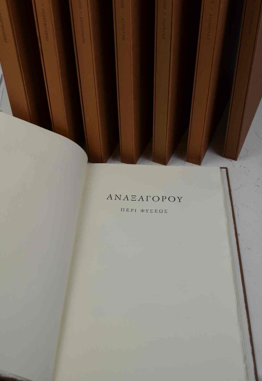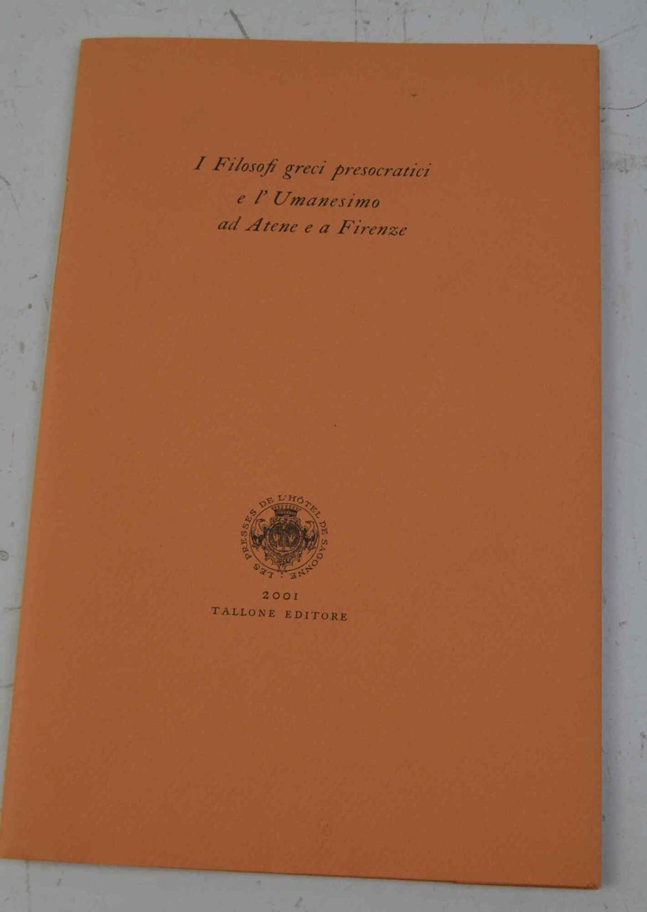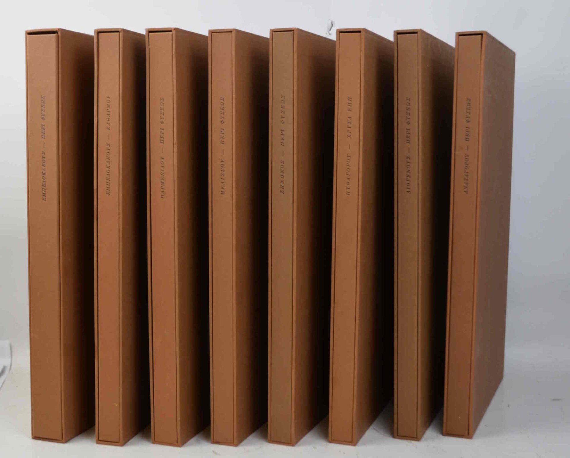 Otto volumi di cm. 34, pp. 50/100 ciascuno. Brossura originale con protezione in velina. Ciascuno dei volumi entro camicia e cofanetto in cart. rigido. Esemplare in ottimo stato di conservazione. Raccolta completa di questa raccolta talloniana stampata in tiratura limitata di 250 esemplari. Il presente appartiene alla tiratura di soli 48 esemplari stampati su carta di Amalfi. Edizione che presenta il testo in ligua originale greca e nella traduzione italiana. Collezione così composta: 1. EMPEDOCLE "La natura". - 2. DIOGENE DI APOLLONIA "La natura". - 3. EMPEDOCLE "Il poema delle purificazioni". - 4. PARMENIDE DI ELEA "Il poema". - 5. MELISSO "La natura o l'essere". - 6. ZENONE D'ELEA "La natura". - 7. PITAGORA "I versi d'oro". - 8. ANASSAGORA "La natura". Si allega l'opuscolo stampato nel 2002 con la lunga presentazione all'opera di 24 pagine di Zanfiropulo.