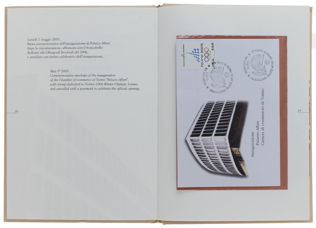 (Codice LO/4995) In 8° 67 pp. Pregiata edizione su carta forte. Tiratura limitata a 1000 copie. Con illustrazioni e tavole a colori e in nero. Allegati: vera busta commemorativa dell'inaugurazione di Palazzo Affari, affrancata con francobollo delle Olimpiadi Invernali 2006, annullata con timbro celebrativo (in tasca trasparente) + 16 francobolli garantiti autentici da Bolaffi (nelle bustine). Cartone editoriale, ex libris. Volume come nuovo ~~~ SPEDIZIONE IN ITALIA SEMPRE TRACCIATA
